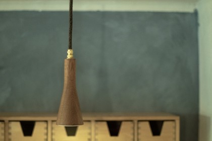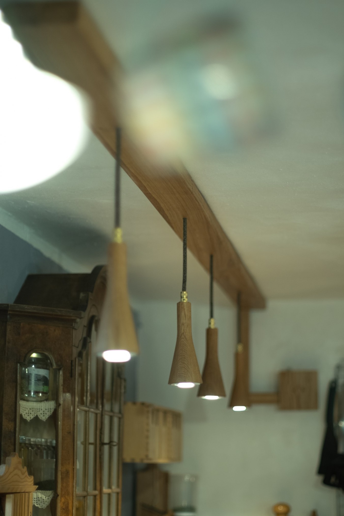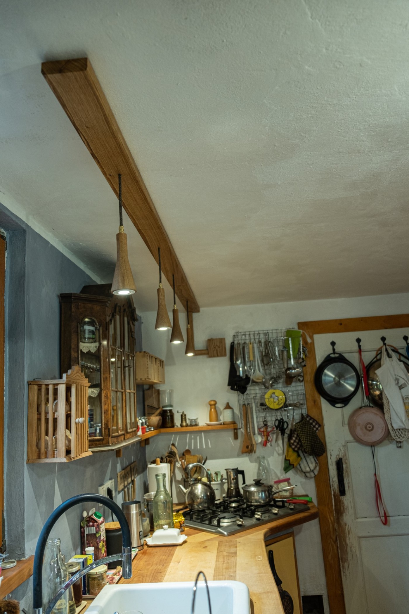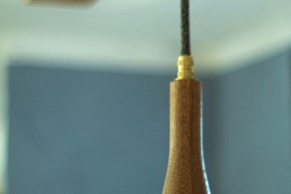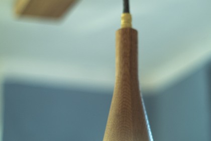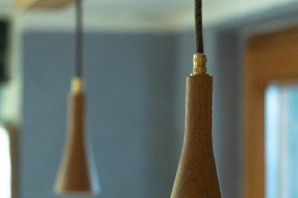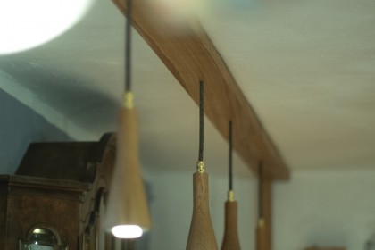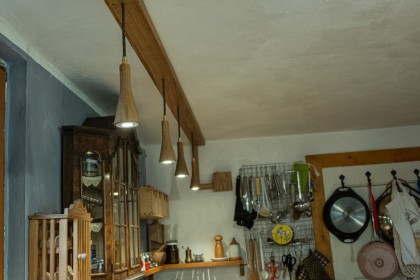Für die Küche eines jahrhunderalten Hunsrückhauses, entwarf ich eine neue Küchenbeleuchtung, auf Basis der Sputnik-Leuchte. Da diese normalerweise mit Dekorleuchten betrieben wird, die den Anforderungen an die Reinlichkeit in einer Küche nur schwer gerecht werden können, integrierte ich Strahler, die bünding in das Holz eingelassen sind und so wenig Raum für Staub und Fett bieten. Man kann sie abwischen.