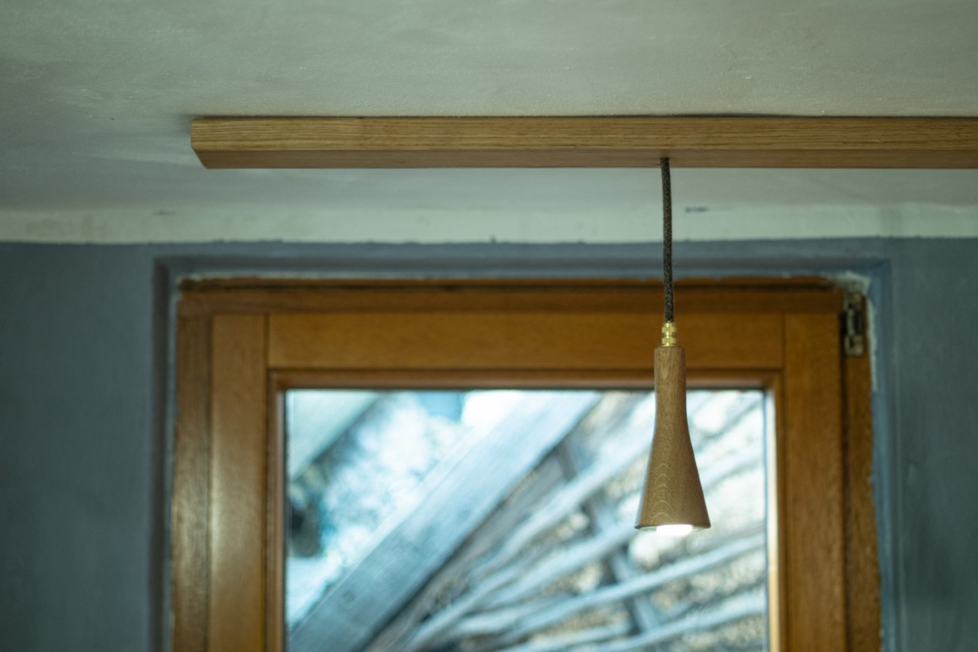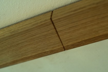 Der Träger aus Eiche nimmt die Ständerbauweise des Hauses wieder auf und interpretiert sie auf zeitlose Weise neu. Schattenfugen retouchieren die unebene Decke.