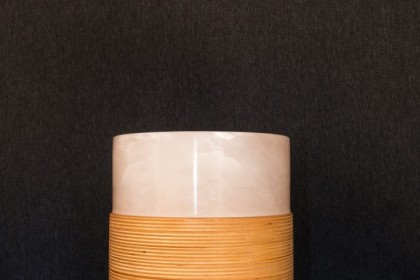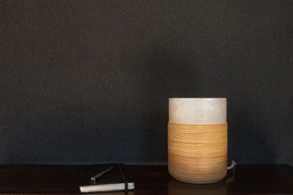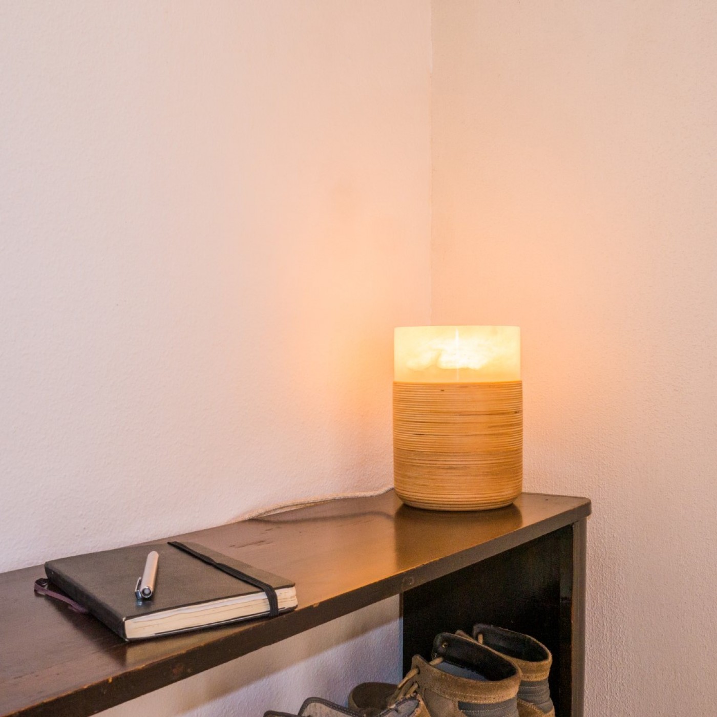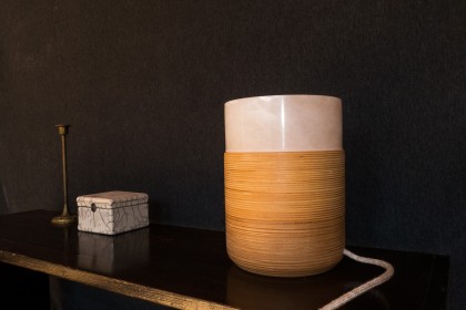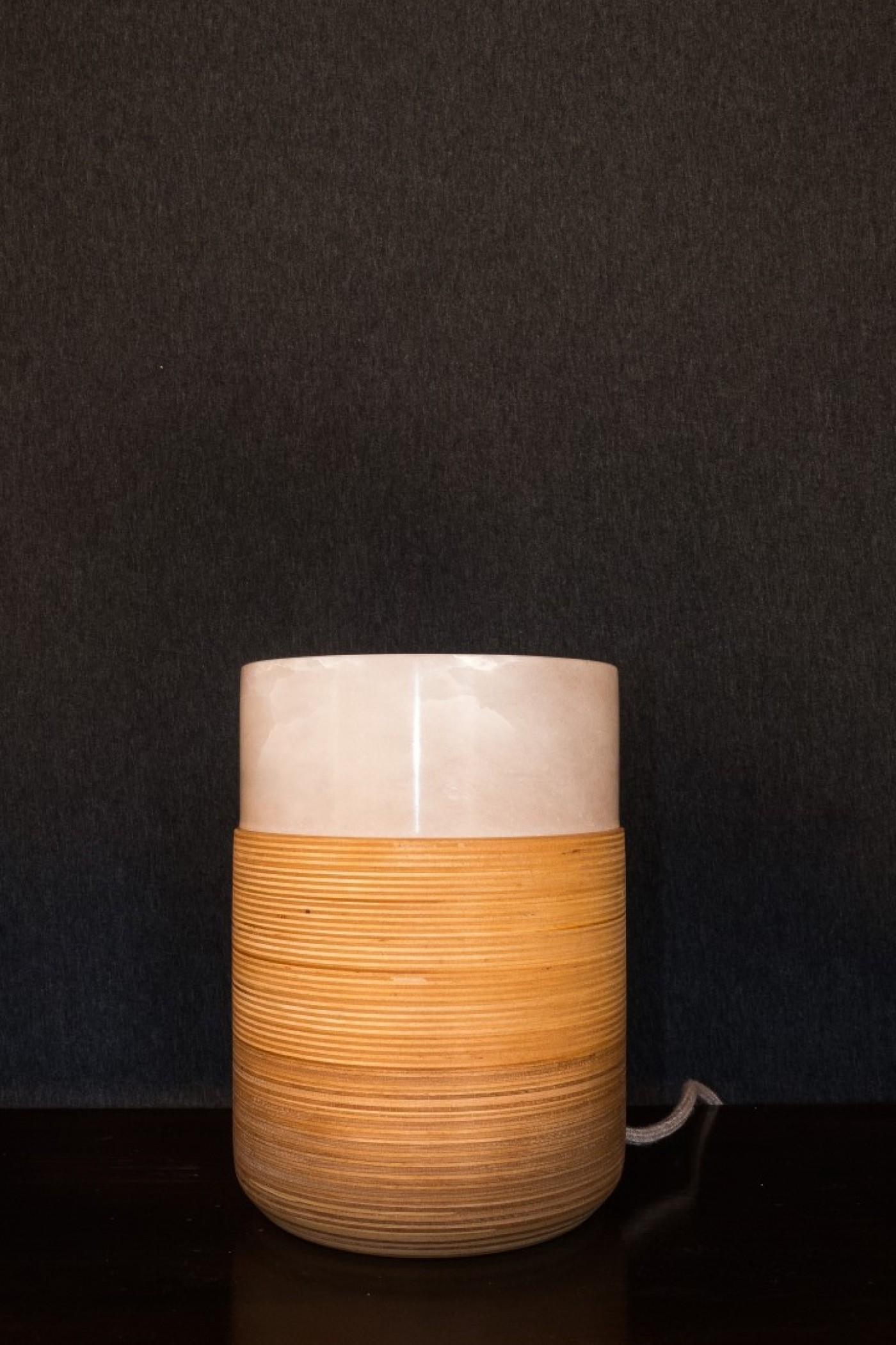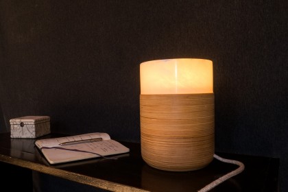 Große Tisch- oder Bodenleuchte aus schichtverleimter Birke und einem Leuchtkörper aus Alabaster.